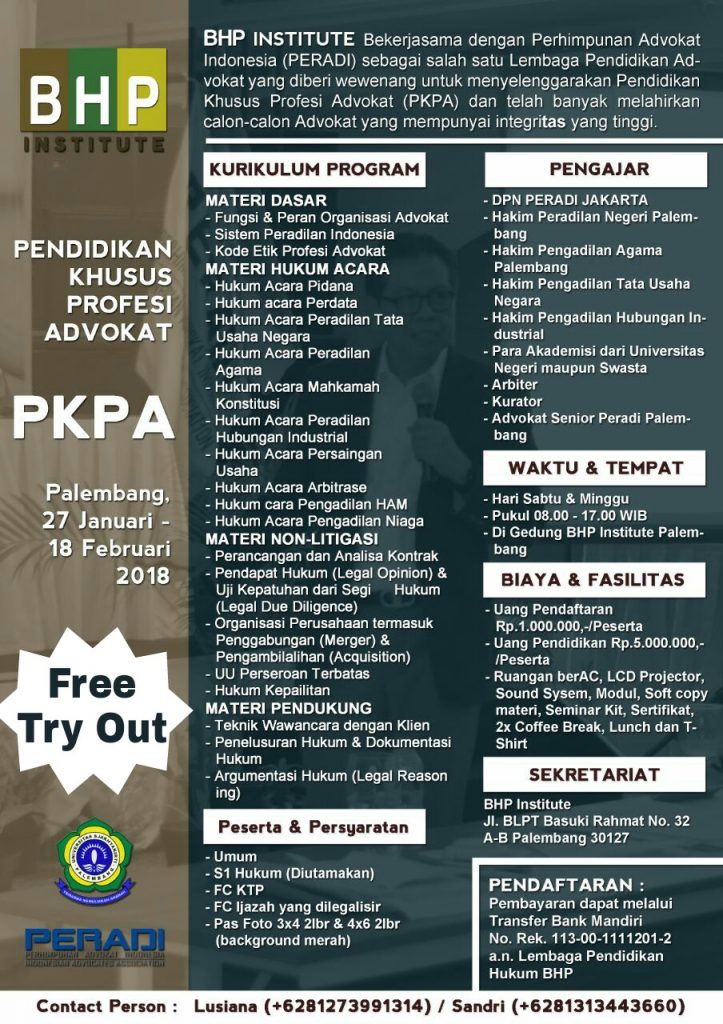 BHP Institute dan PerguruanTinggi Satyakirti Palembang bekerja sama menyelenggarakan PKPA di BHP Institute Palembang.