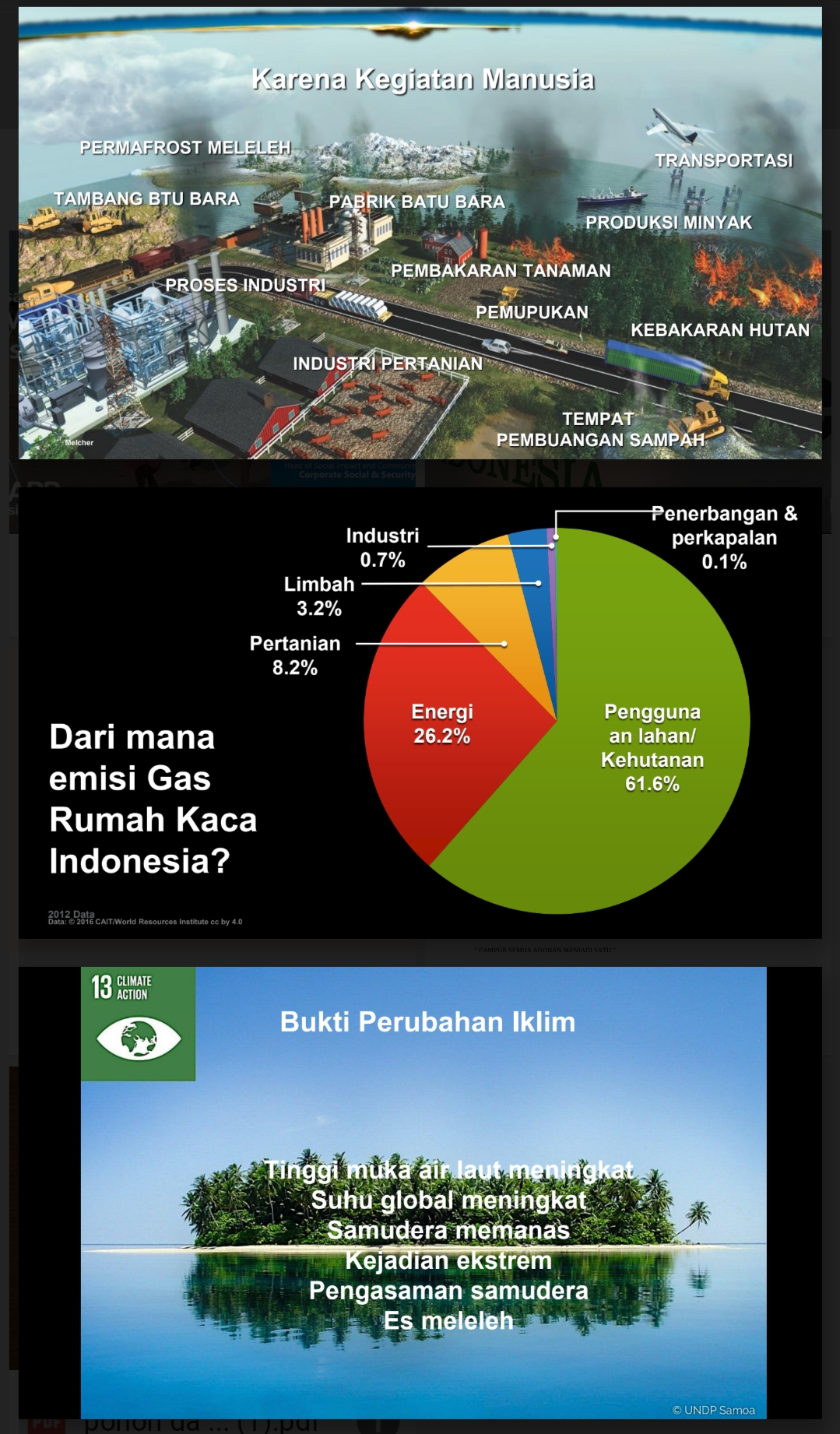 Di slide ini juga di paparkan aktivitas manusia yang menyumbang emisi gas kaca di Indonesia