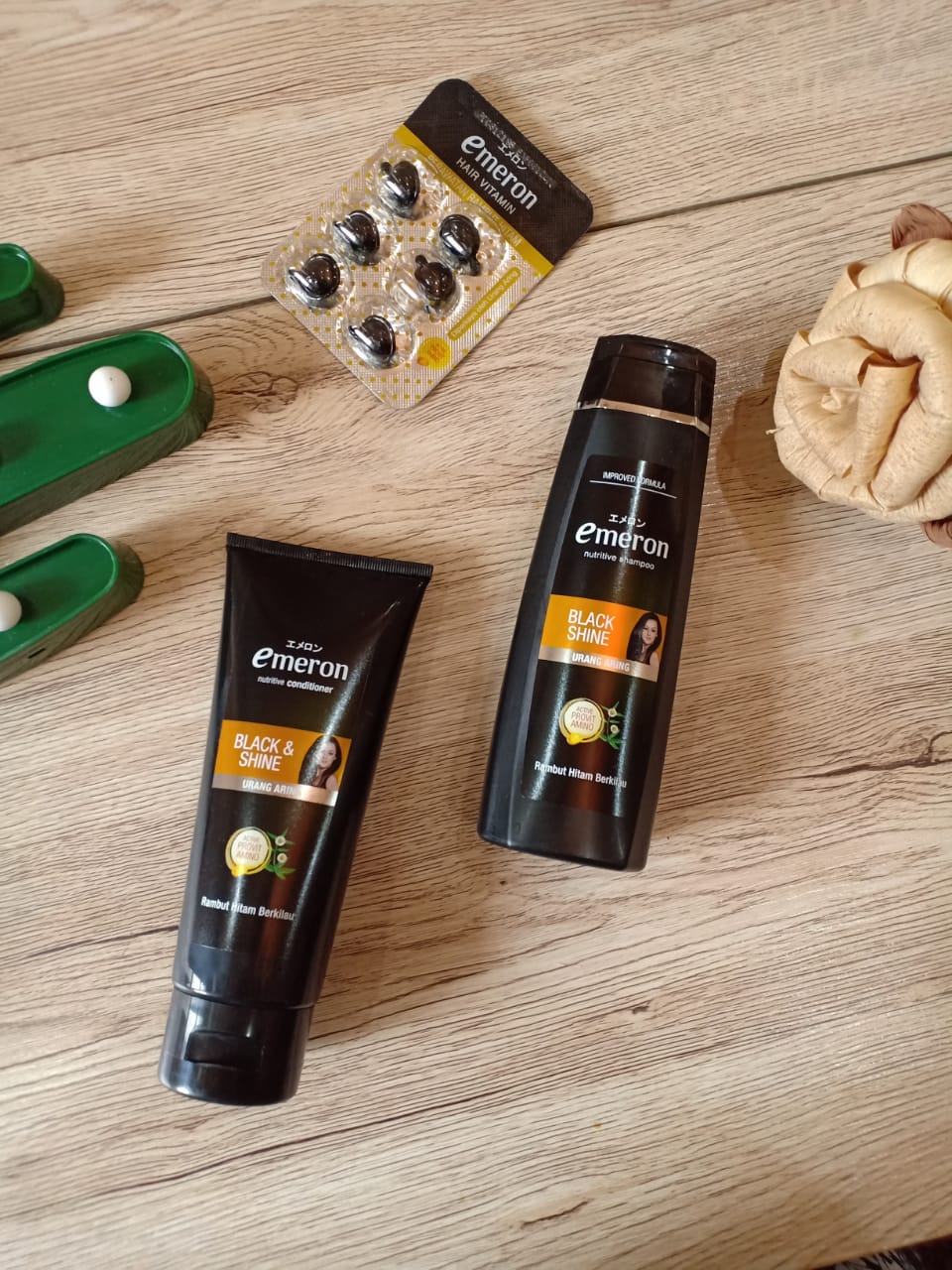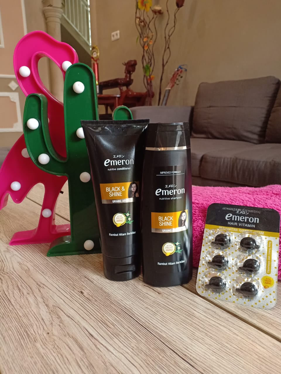 Untuk rambut aku gak mau main-main. Setelah perjalanan yang cukup panjang menemukan sampo yang membuat rambutku lembut dan mudah diatur, secara kan rambutku ini udah bolak balik bleaching dan ganti warna jadi memang terlihat kering dankusam. Nih, aku kasih bocoranya. Aku memilih produk perawatan rambut dari Emeron.