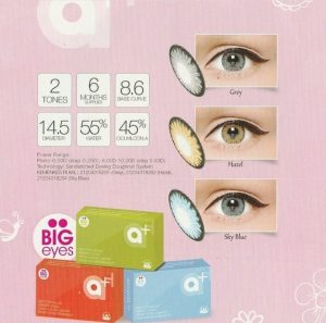 Oiya. Aku dapet yang big eyes a+ sama X2 Bio Color. Yang warnya aduhay syekali. X2 mengandung 45% water dengan tehnologi sandwich dyeig doughnut (SDD Tech cast moulding). dengan Color range : hazel,grey, blue